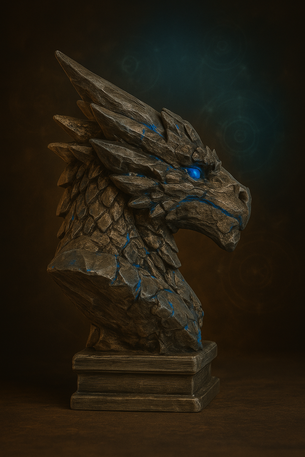 Forged from art, myth, and machine, this sculpture captures the raw might of a dragon carved from living stone. Veins of blue energy pulse through its rugged surface, giving the illusion of magic flowing beneath ancient scales.